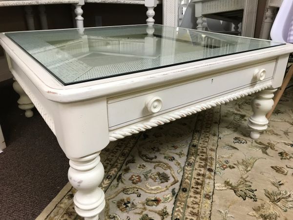 42 Square Glass Top Off White Distressed Coffee Table With Shadow
